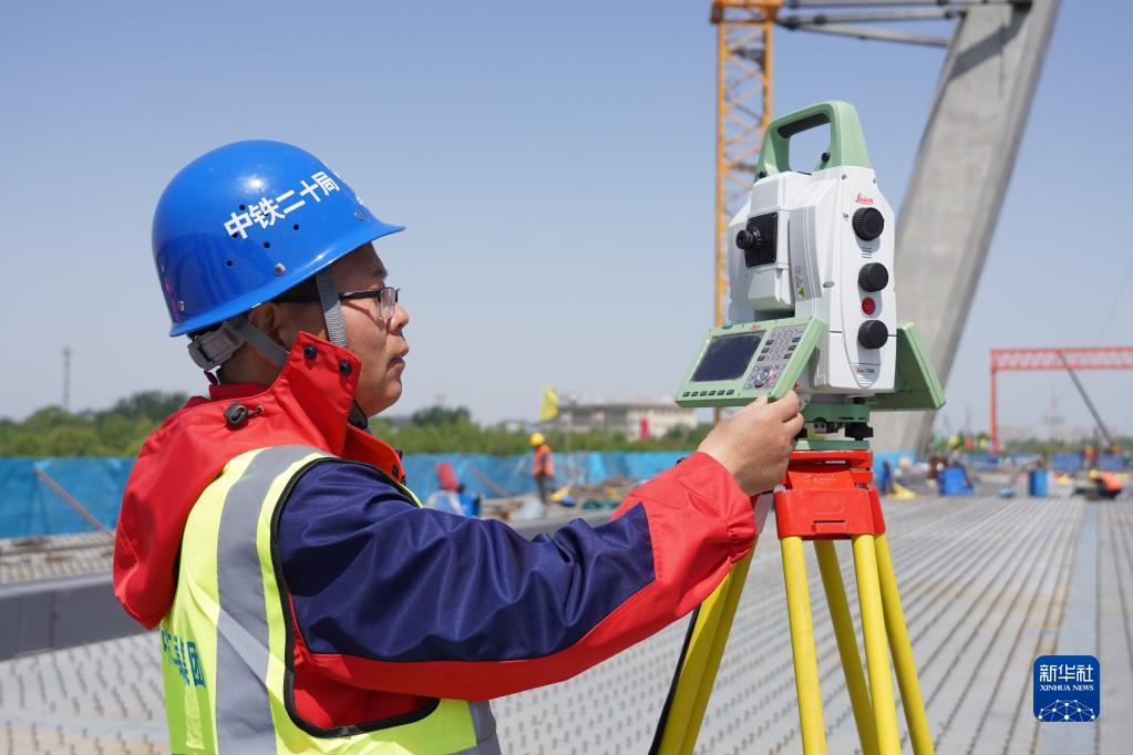 4月29日,技術人員在石家莊市學府路東延跨太平河橋主橋合龍現(xiàn)場進行測量作業(yè)。