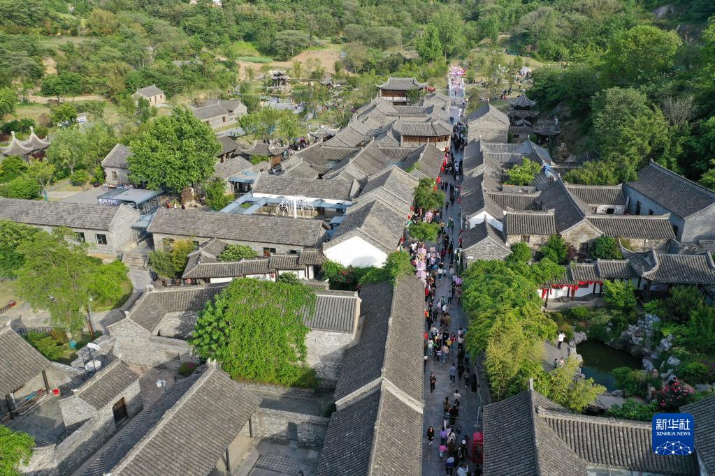 4月29日,市民和游客在盱眙縣第一山歷史文化街區(qū)游玩(無人機照片)。