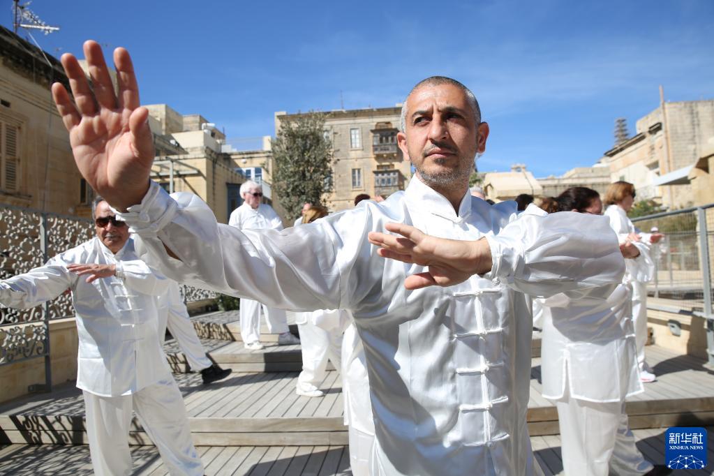 4月29日,在馬耳他瓦萊塔,當(dāng)?shù)靥珮O愛(ài)好者打太極拳。