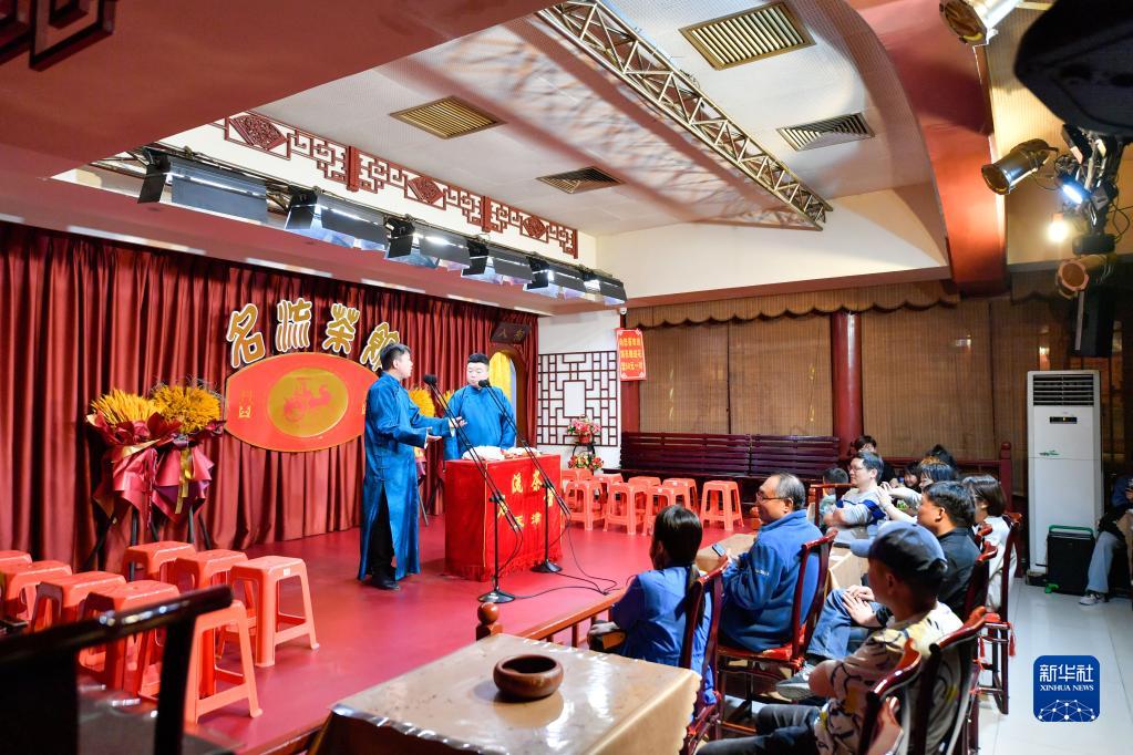 4月29日,游客在天津古文化街一家相聲茶館里聽相聲。