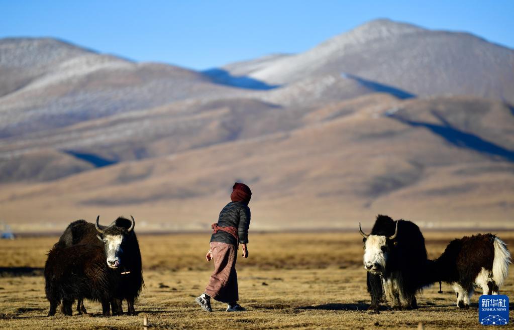 青海省玉樹藏族自治州稱多縣珍秦鎮二村牧民放牧歸來(2020年10月28日攝)。