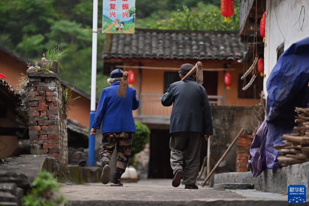 在廣西融安縣東起鄉崖腳村銅板屯,85歲龍顯星(右)和老伴勞作歸來(2023年4月24日攝)。