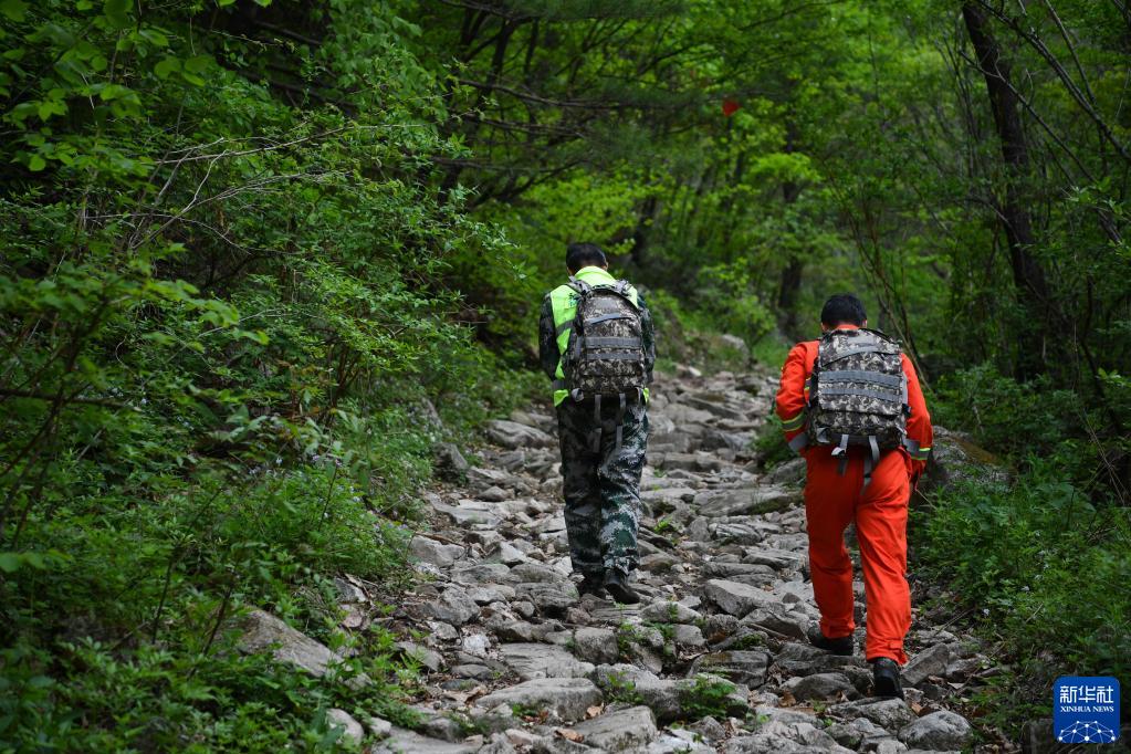 陜西省西安市鄠邑區(qū)澇峪國有生態(tài)林場護(hù)林員在秦嶺營盤溝巡查(2022年4月27日攝)。