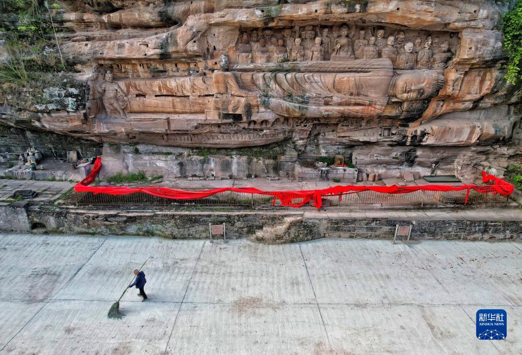 4月3日,吳忠富在臥佛院內打掃衛生(無人機照片)。