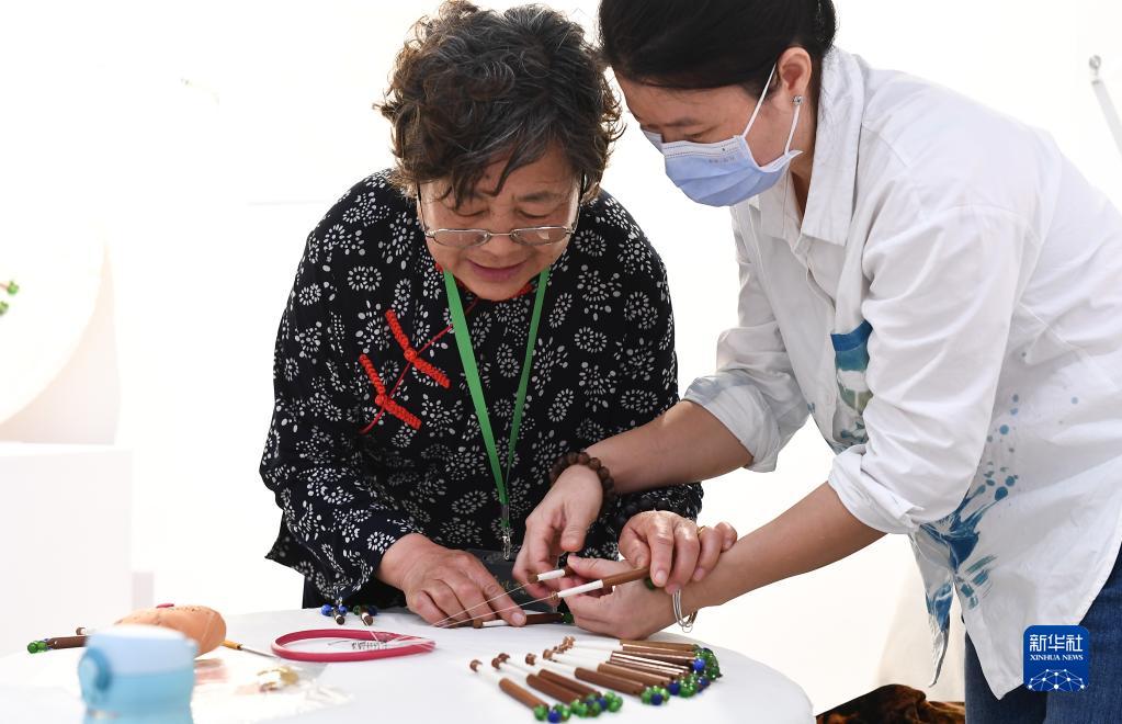 4月30日,在2023海南錦繡世界文化周非物質文化遺產傳統織繡印染技藝項目精品展上,觀眾在向傳承人學習編織青州府花邊大套。