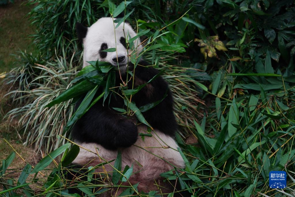 在香港海洋公園,大熊貓“樂樂”在吃早餐(4月19日攝)。