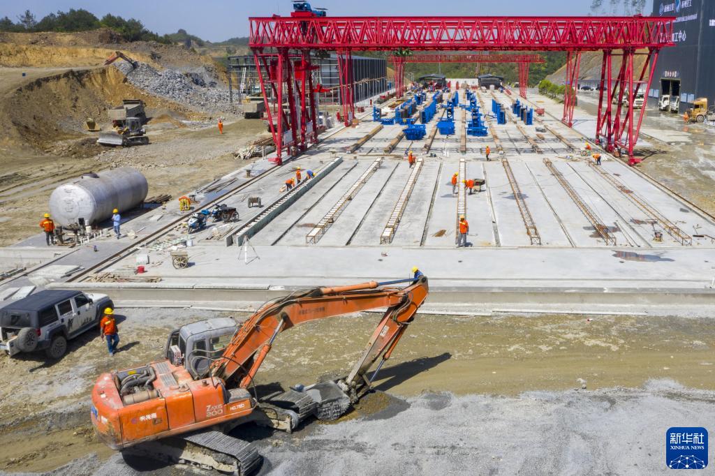 4月30日,在329國道浙江省杭州市臨安區的一處改建工程項目現場,施工人員在現場忙碌(無人機照片)。