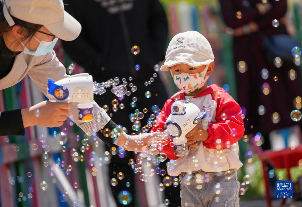 4月30日,家長帶著小朋友在河北省遵化市一景區玩耍。