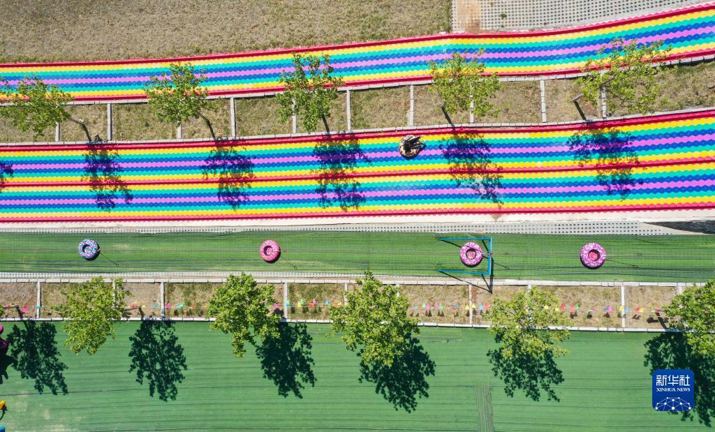 4月30日,游客在河北省遵化市一景區(qū)體驗七彩滑道游樂項目(無人機照片)。