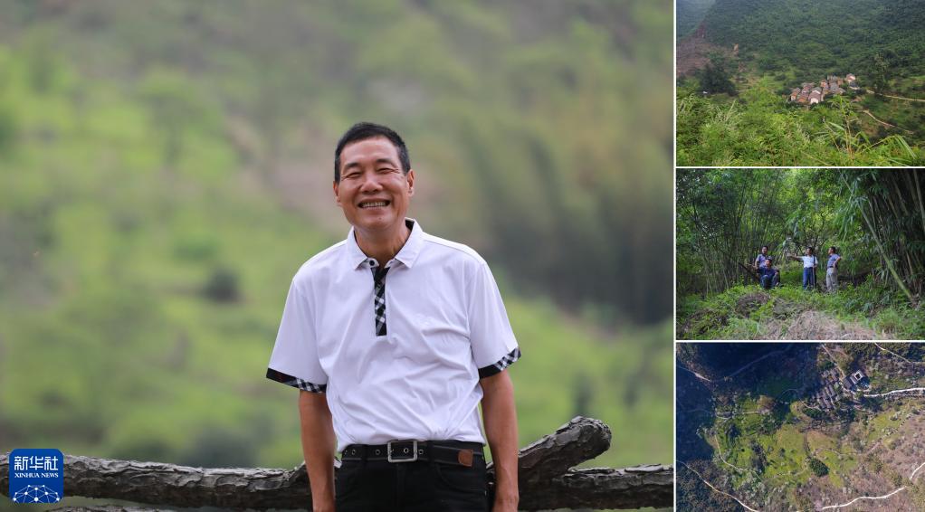 拼版照片:左圖為廣西融安縣東起鄉(xiāng)銅板屯60歲的村民龍飛任(2022年3月20日攝);右上圖為2012年10月21日拍攝的銅板屯;右中圖為龍飛任(左一)和村民們在山上規(guī)劃銅板屯的發(fā)展(2013年6月19日攝);右下圖為2019年3月3日無人機(jī)拍攝的銅板屯。