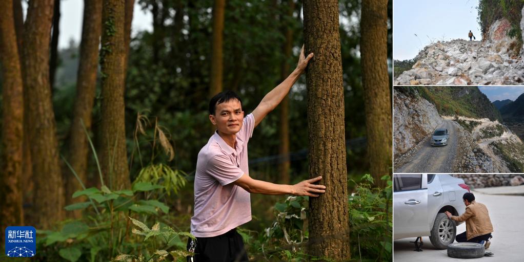 拼版照片:左圖為46歲的韋德王在廣西大化瑤族自治縣都陽林場里(2023年4月23日攝);右上、中、下圖為韋德王在廣西大化瑤族自治縣板升鄉八好村任駐村“第一書記”時走訪村民和更換汽車輪胎的畫面(2019年12月16日攝)。