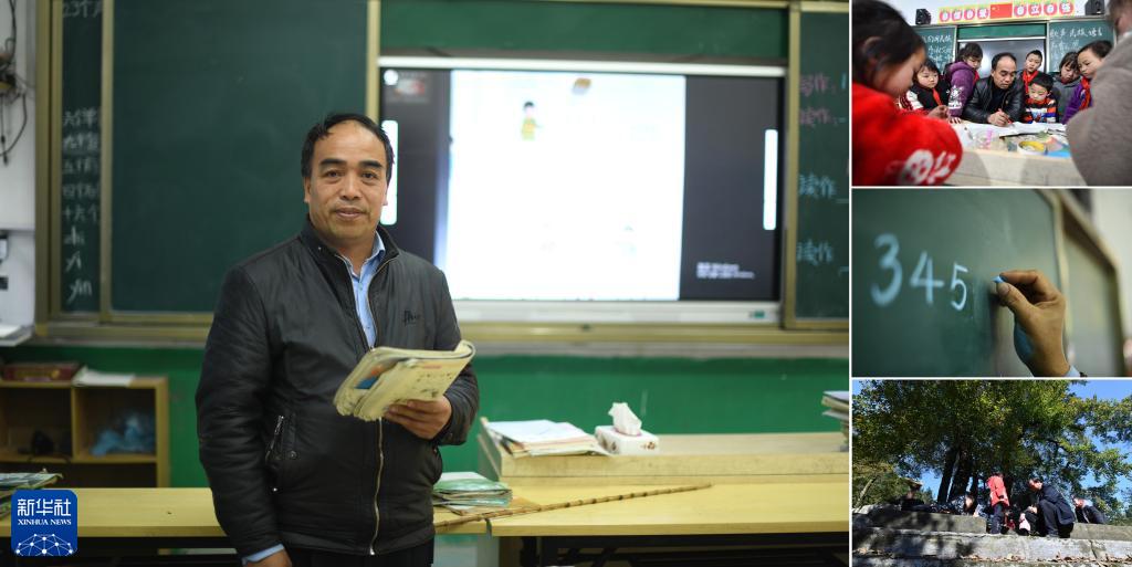 拼版照片:左圖為廣西融水苗族自治縣桿洞鄉烏英教學點53歲的老師潘先鋒(2023年4月25日攝);右上圖為潘先鋒給孩子們輔導功課(2022年1月12日攝);右中圖為潘先鋒在黑板上寫字(2023年4月25日攝);右下圖為潘先鋒在給學生輔導功課(2021年11月25日攝)。