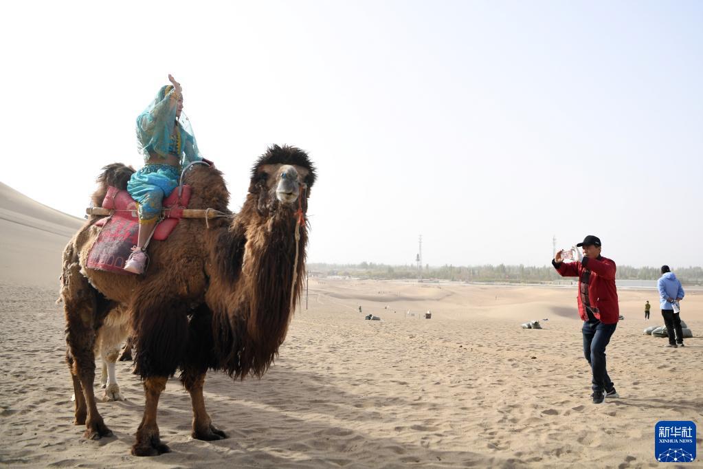 “從前,駱駝是絲綢之路上重要的交通工具;現在,我們的駱駝已變成敦煌絲路旅游上的重要一環,為游客帶來不一樣的體驗,也是我們重要的增收手段。”月牙泉村村民曹文華一邊走一邊向游客介紹。