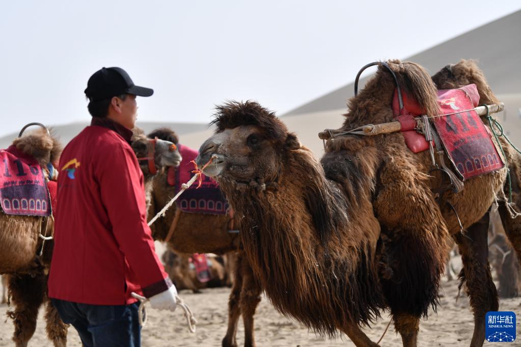 曹文華牽著駱駝在鳴沙山月牙泉景區(qū)駱駝騎乘點(diǎn)等待游客(4月24日攝)。