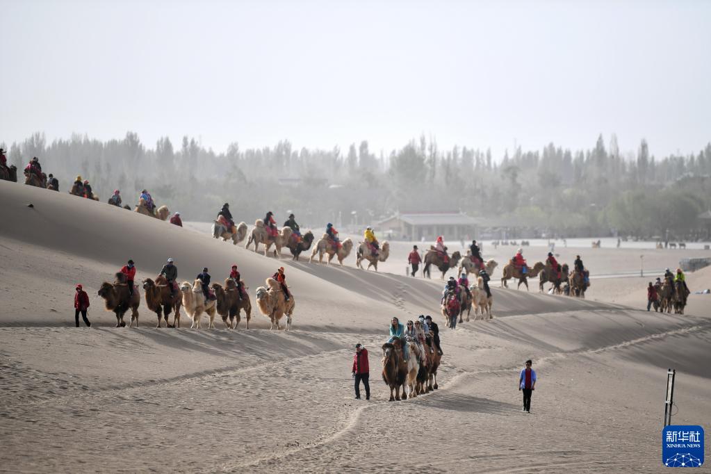 載著游客的駝隊行走在鳴沙山月牙泉景區(4月24日攝)。