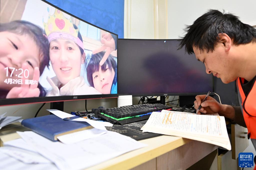 齊國超在電腦前看書,備考一級建造師(4月29日攝)。