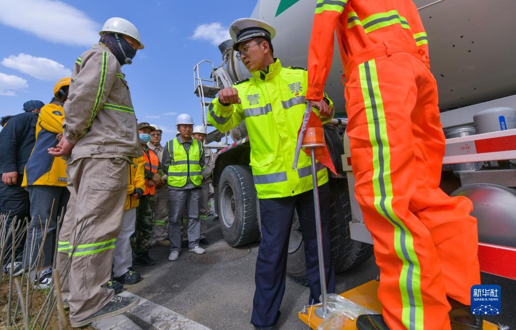 4月30日,烏魯木齊市公安局交通警察支隊宣傳科民警李亮東(右)向活動參與者講解交通安全知識。