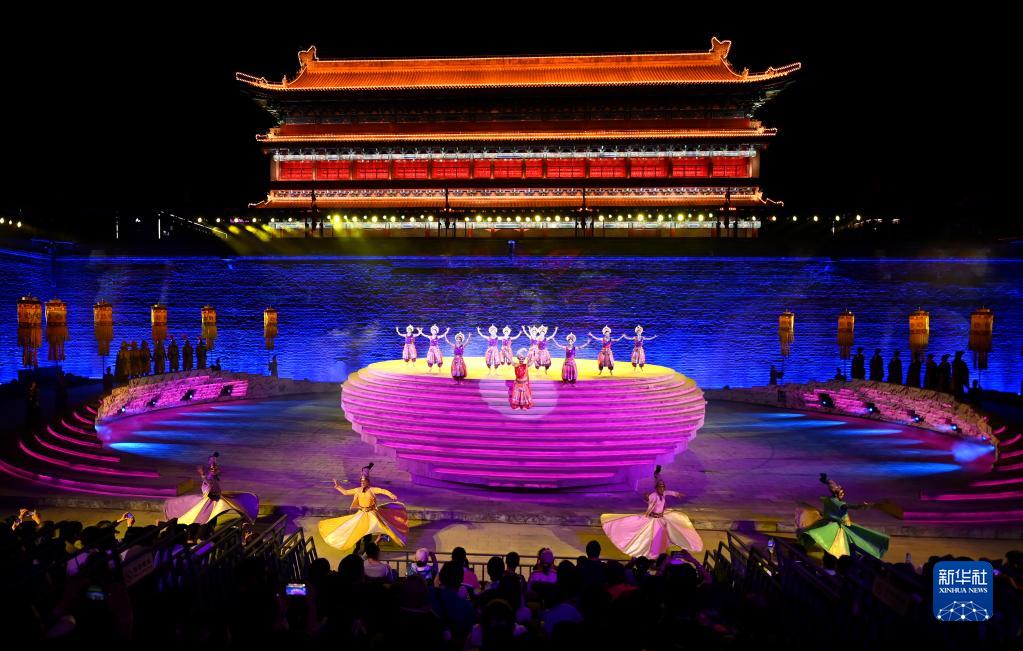 4月30日,游客在西安城墻景區觀看《夢長安——大唐迎賓盛禮》。