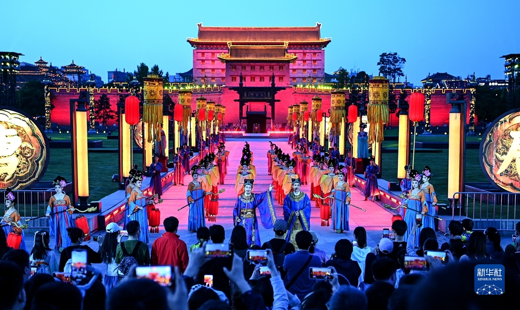 4月30日,游客在西安城墻景區(qū)觀看《夢長安——大唐迎賓盛禮》。