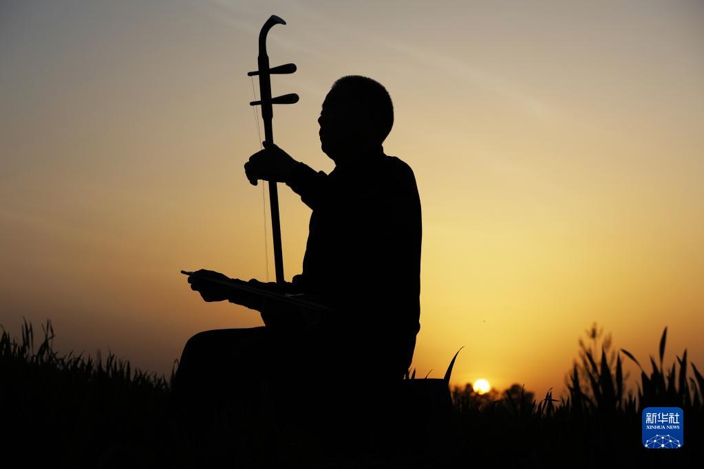 4月16日,高振保在田間拉二胡。