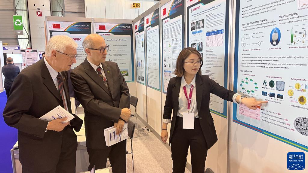 4月29日,在瑞士日內瓦舉行的第48屆日內瓦國際發明展上,金獎項目“S Zorb汽油吸附脫硫技術”發明團隊代表宋燁(右一)向參觀者介紹發明項目(手機照片)。