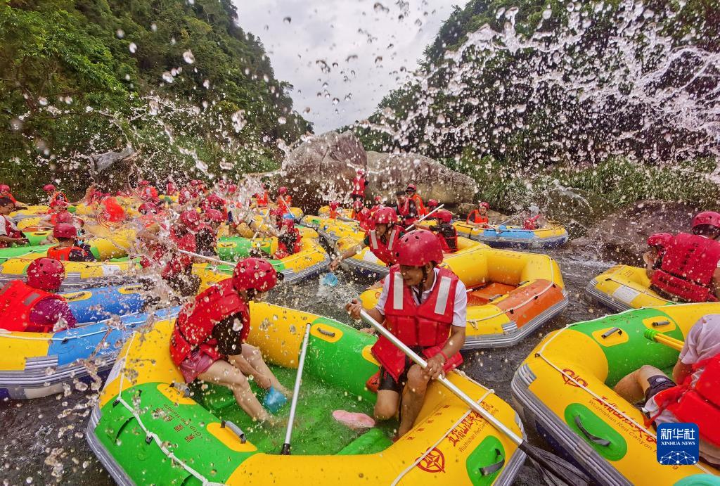 4月30日,游客在海南省五指山市體驗紅峽谷漂流。
