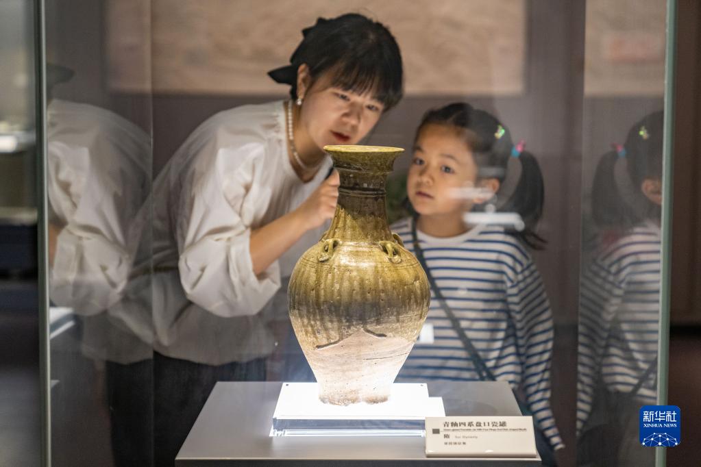 4月29日,參觀者在安徽省合肥市肥東縣博物館欣賞隋朝青釉四系盤口瓷罐。