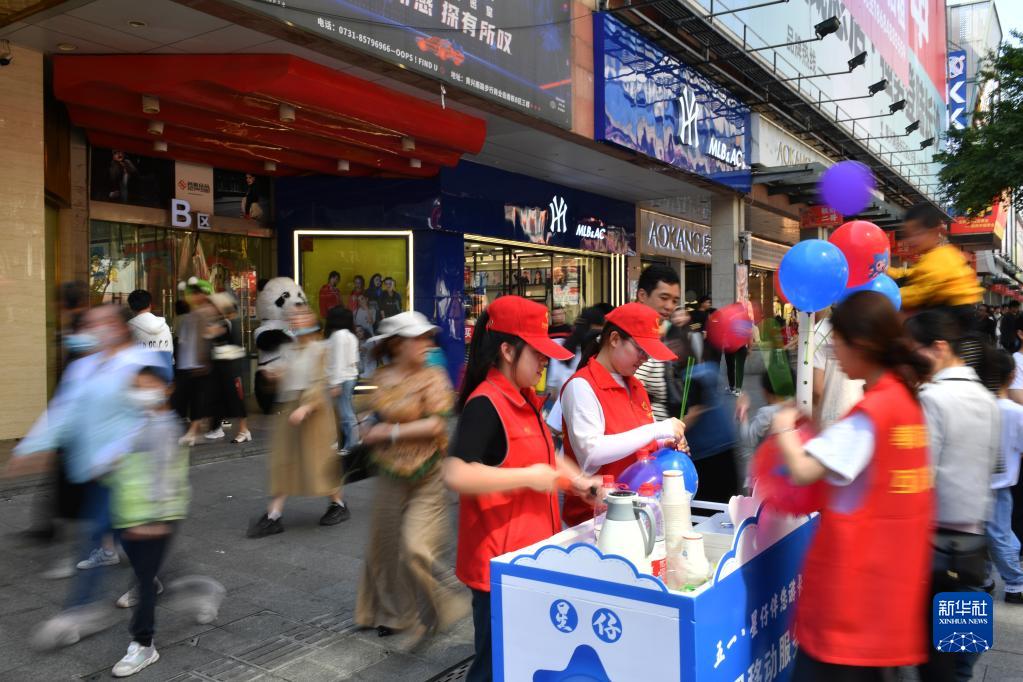 5月1日,志愿者在湖南省長沙市天心區(qū)一處商圈做志愿服務(wù)。
