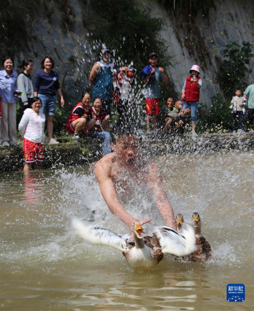 5月1日,村民在貴州省黔東南苗族侗族自治州雷山縣大塘鎮咱刀村體驗捉鴨游戲。