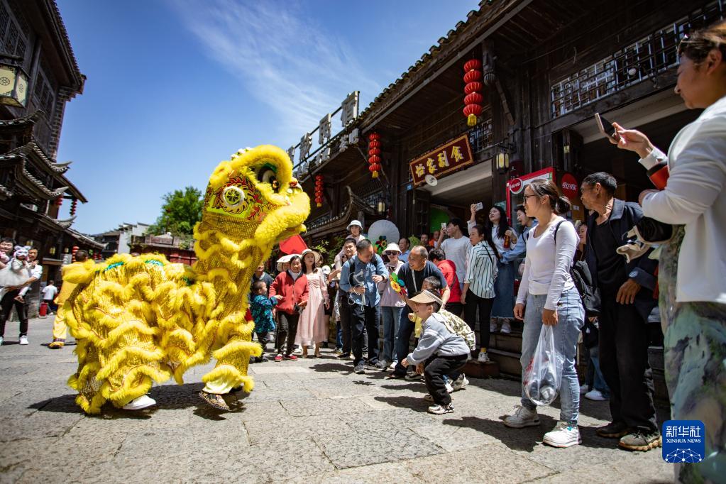 4月30日,游客在重慶市秀山土家族苗族自治縣洪安古鎮(zhèn)老街觀看舞獅表演。
