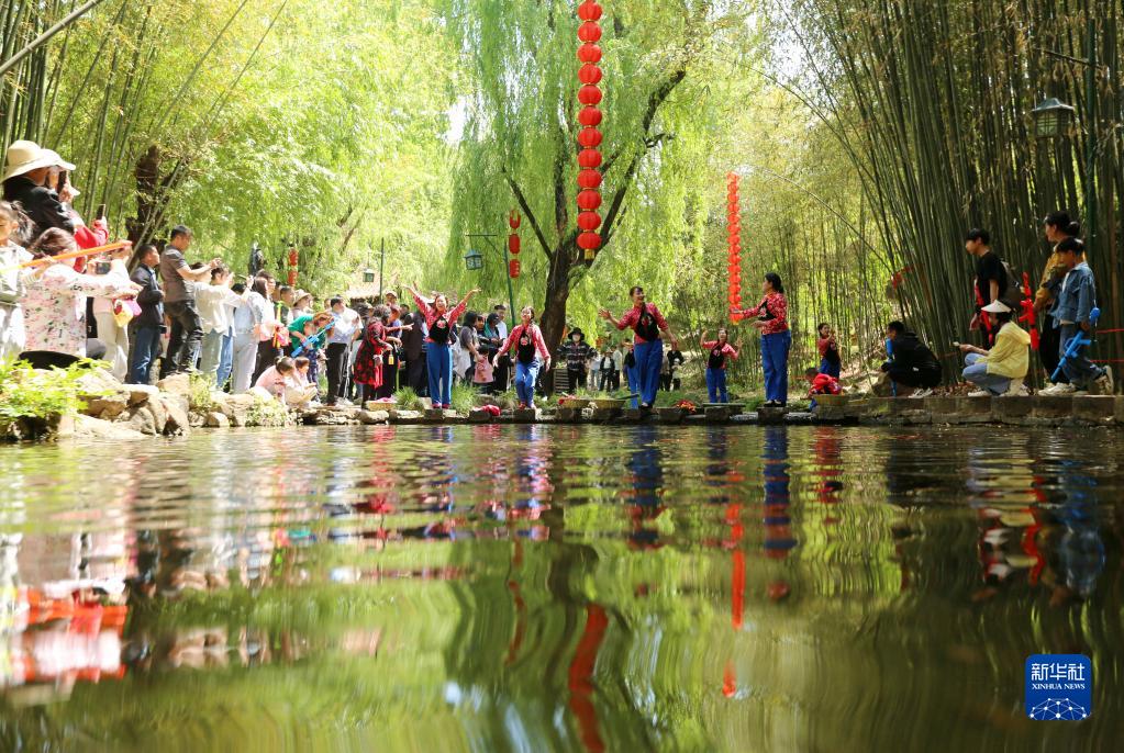4月30日,游客在山東省臨沂市沂南縣銅井鎮(zhèn)竹泉村觀看民俗表演。