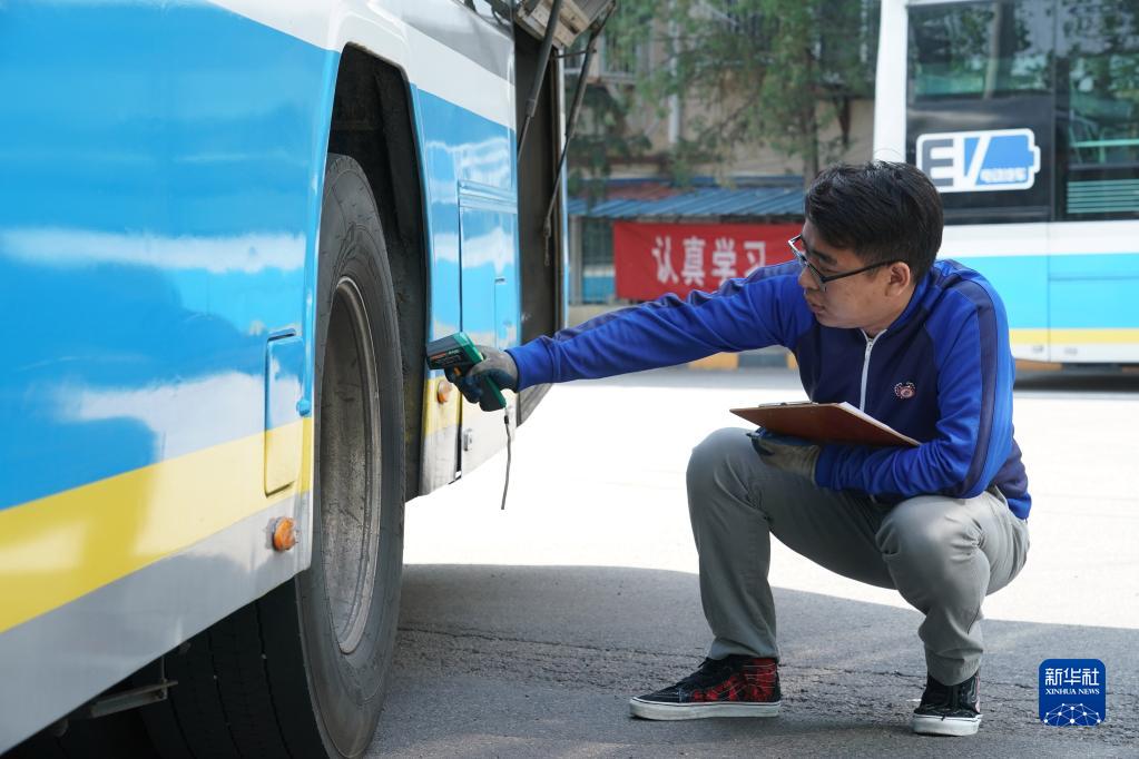 5月1日,在位于北京市朝陽區的柳芳公交場站,技術員王陸斌對車輪測溫。