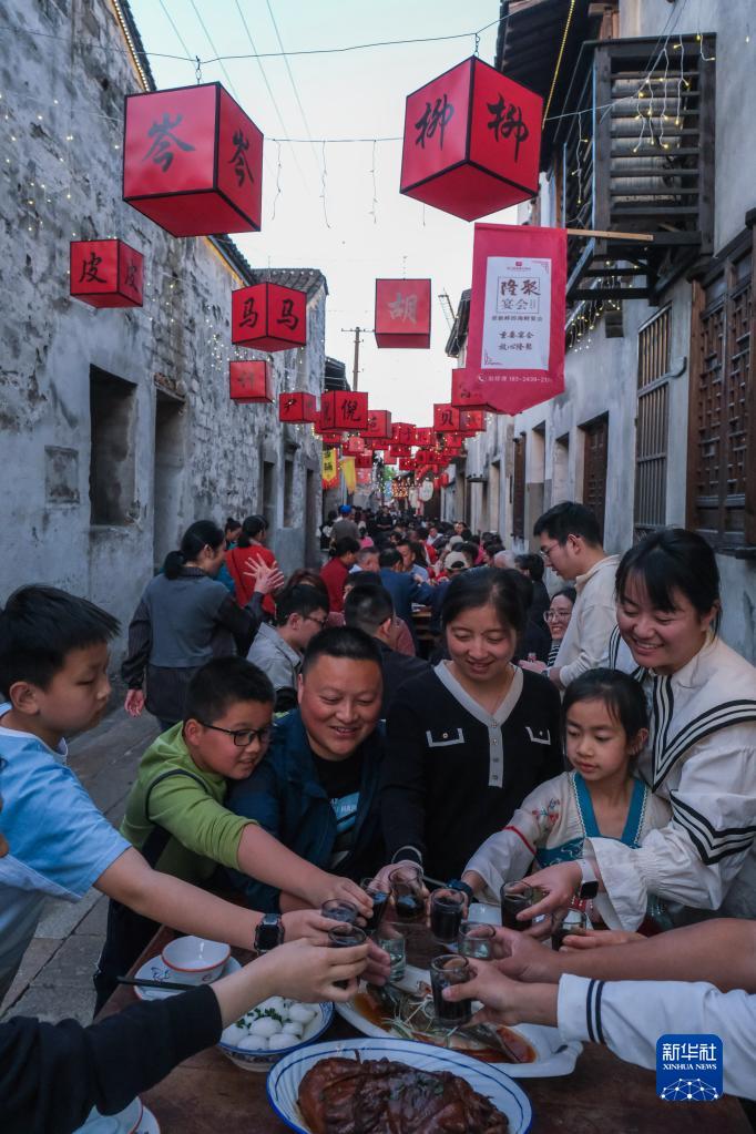 5月1日,在浙江嘉興桐鄉市崇福鎮運河文化歷史街區的橫街上,游客參加古鎮特色長街宴。