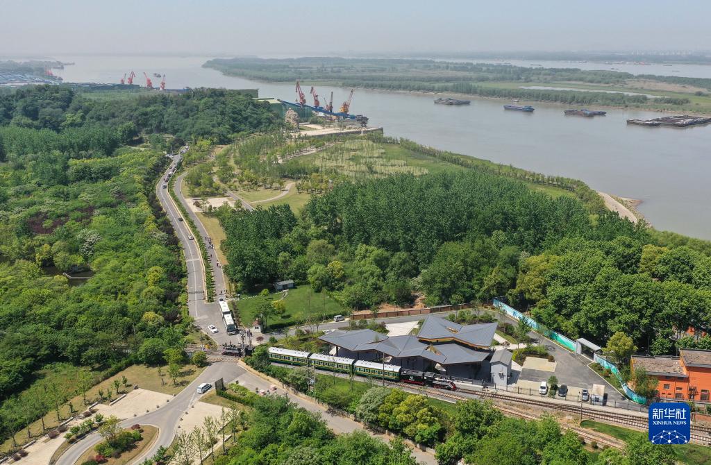 5月1日,“梅鋼號(hào)”觀光車行駛在南京市雨花臺(tái)區(qū)三山磯生態(tài)公園(無人機(jī)照片)。