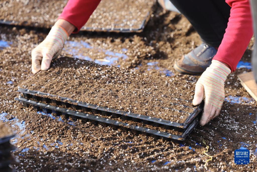 5月1日,河北省承德市豐寧滿族自治縣大灘鎮扎拉營村的農民在進行白菜育苗。