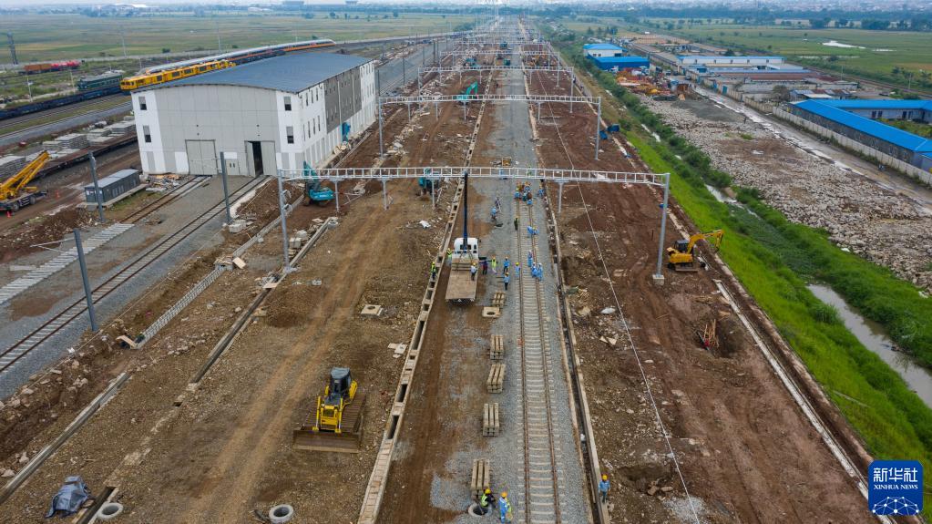 5月1日,在印度尼西亞萬隆,建設者在雅萬高鐵德卡魯爾動車所施工現場作業(無人機照片)。