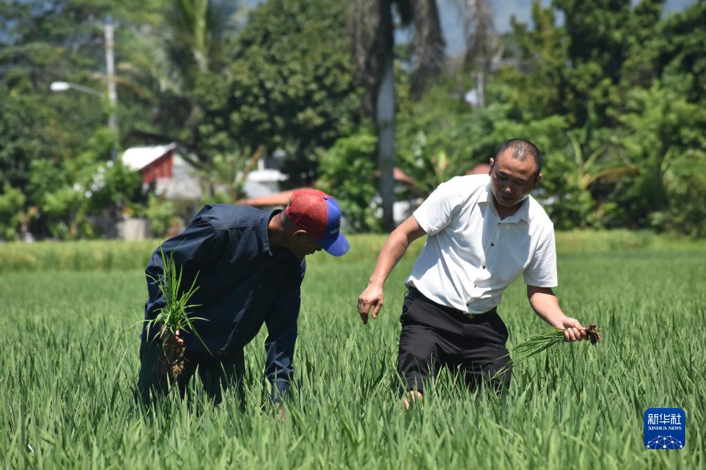 4月26日,在多米尼加首都圣多明各西北約80公里處,中國農業專家(右)和當地農民在多米尼加國家水稻培訓中心的一片試驗田內工作。
