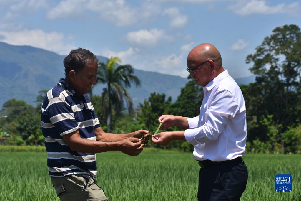 4月26日,在多米尼加首都圣多明各西北約80公里處,中國農業專家(右)和一名多米尼加水稻專家(左)在多米尼加國家水稻培訓中心的一片試驗田內討論水稻種植問題。