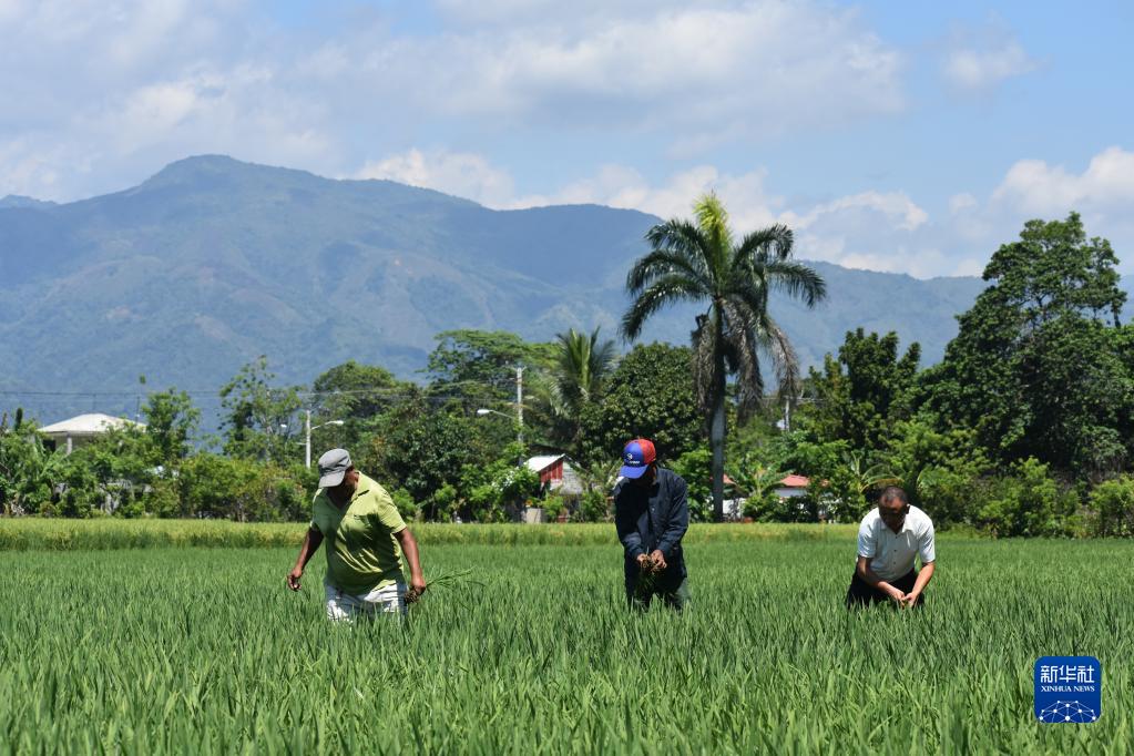 4月26日,在多米尼加首都圣多明各西北約80公里處,中國(guó)農(nóng)業(yè)專家(右)和當(dāng)?shù)剞r(nóng)民在多米尼加國(guó)家水稻培訓(xùn)中心的一片試驗(yàn)田內(nèi)工作。