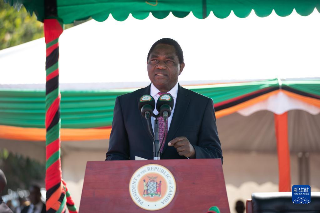 5月1日,在贊比亞首都盧薩卡,贊比亞總統希奇萊馬在“五一”國際勞動節游行活動上講話。