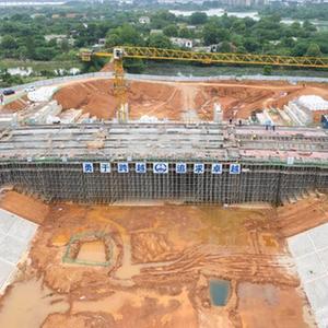 5月2日在沅江市中心城區水環境綜合治理一期工程拍攝的團山橋建設現場(無人機照片)。