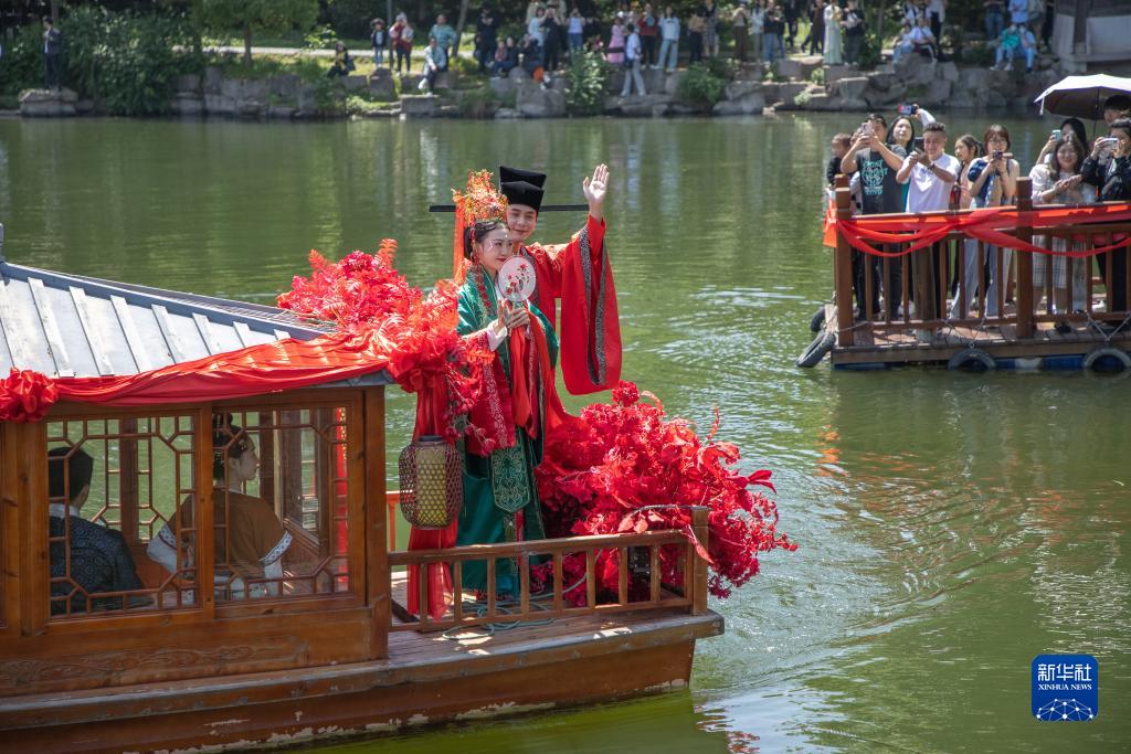 4月30日,在浙江省臨海市,一場水上傳統(tǒng)習(xí)俗婚禮演出在東湖公園上演。