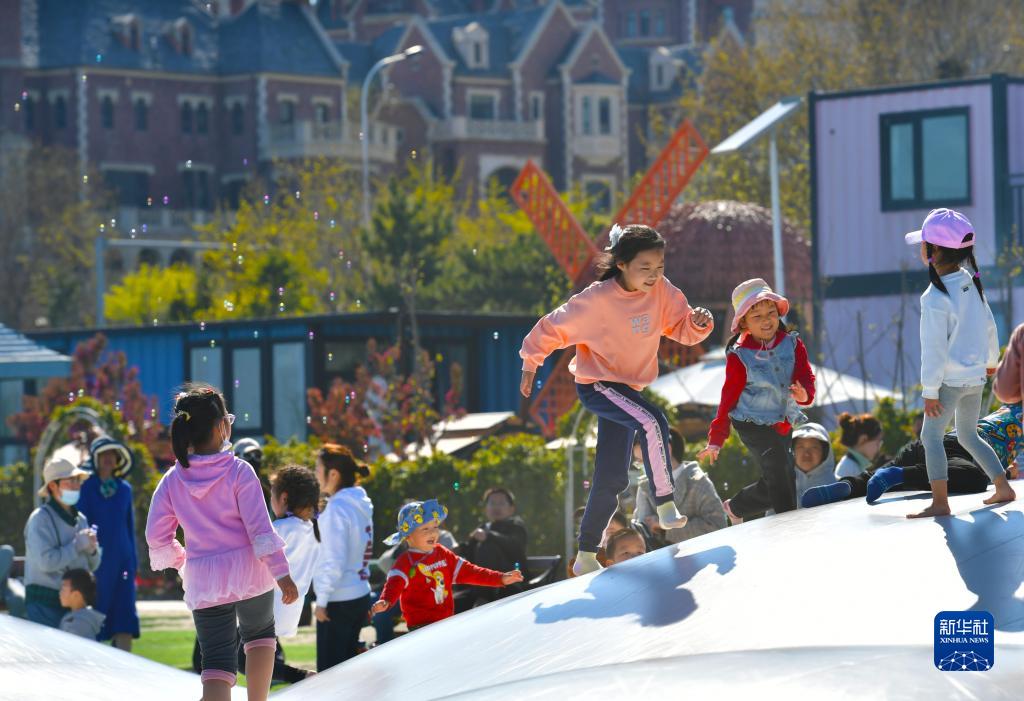 4月30日,在遼寧省大連市塔河灣歡樂海岸,小朋友在游玩。