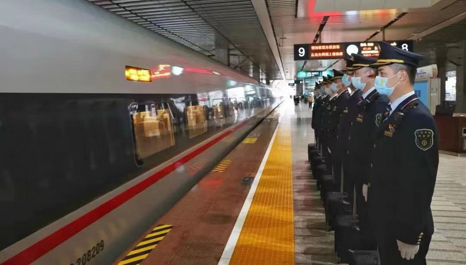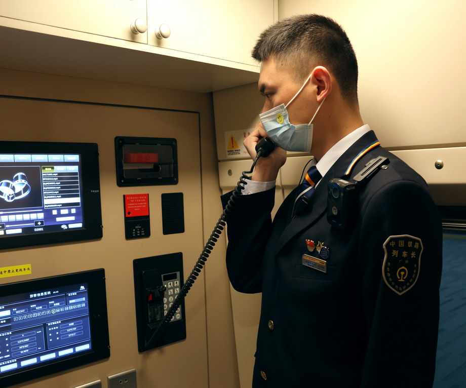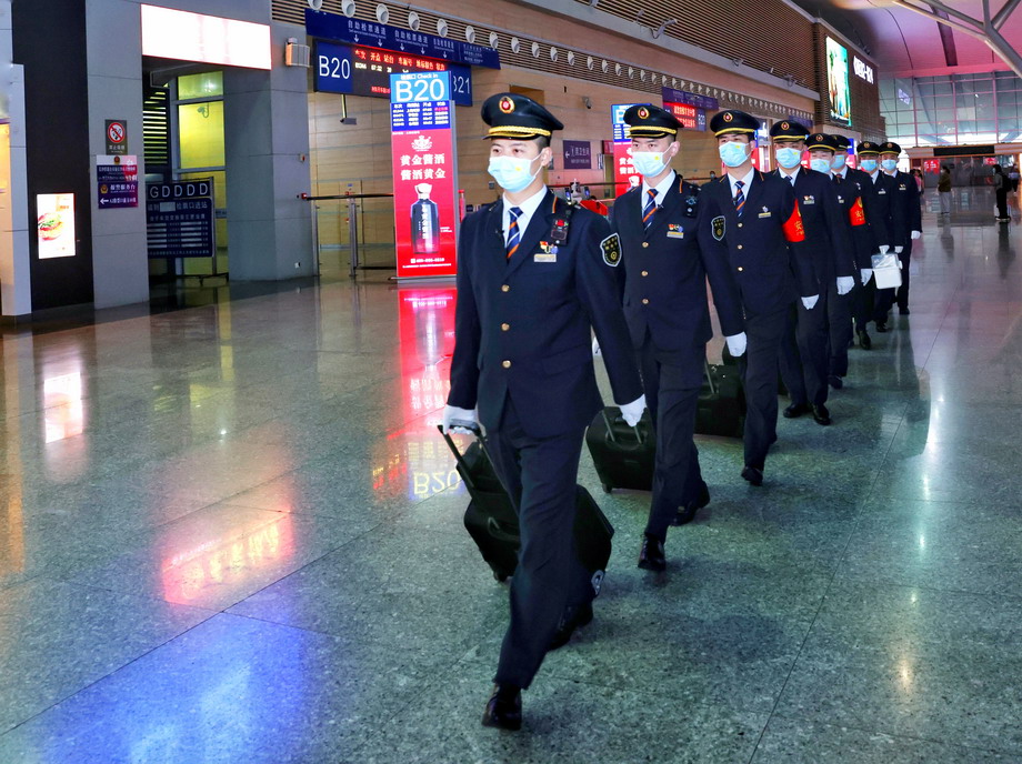 五一假期期間,長沙客運段動二車隊G1348次高鐵上“鐵男組”乘組光榮在崗。圖為長沙客運段動二車隊G1348次出乘。新華網(wǎng)發(fā)