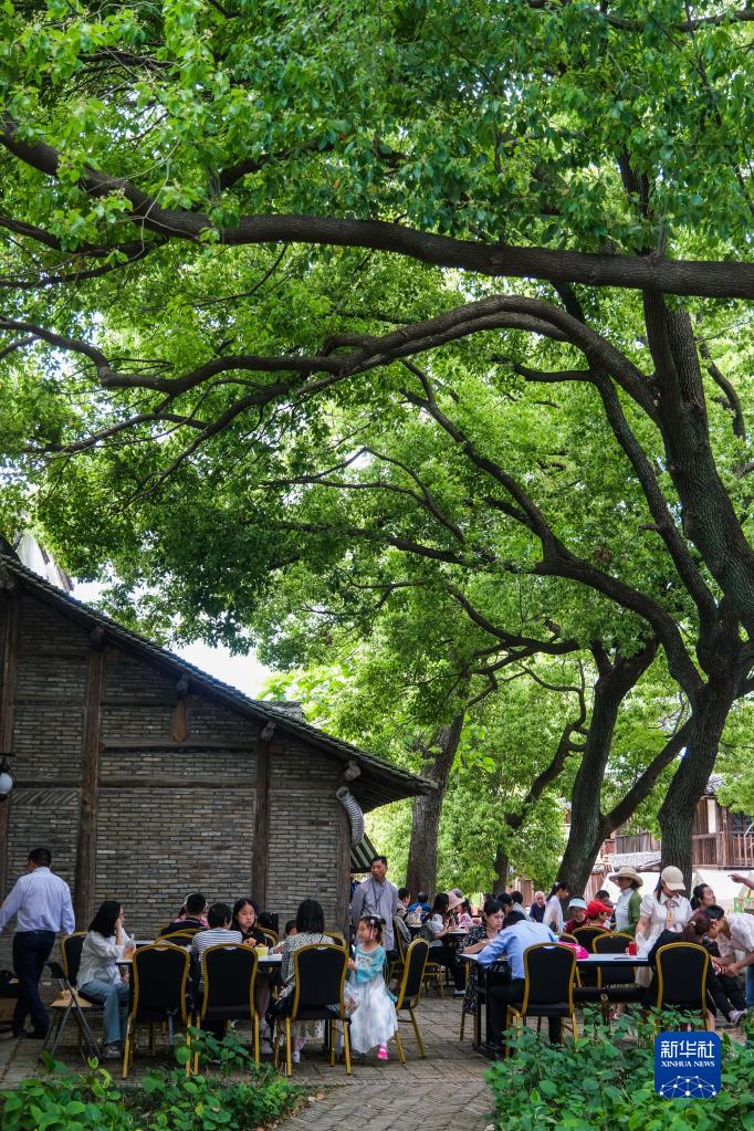 5月2日,游客在濮院時尚古鎮內休息、用餐。