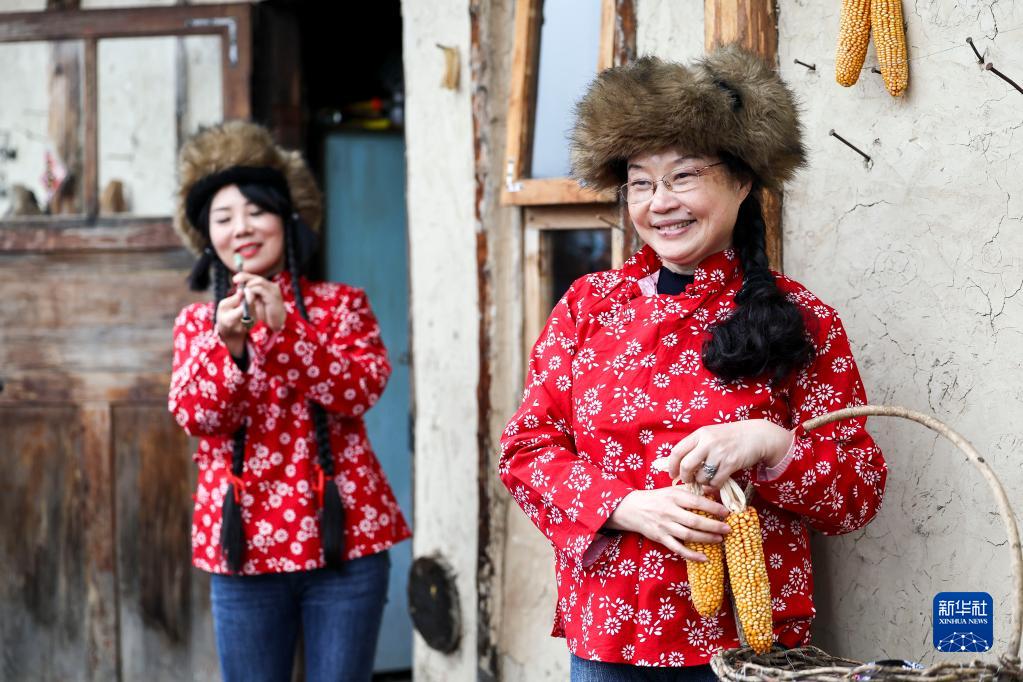 游客在錦江木屋村穿戴特色服飾拍照留念(2023年4月6日攝)。