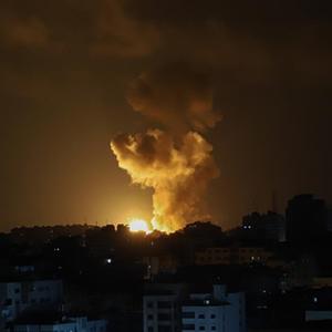 這張5月2日拍攝的照片顯示,以軍空襲造成的爆炸將加沙城天空照亮。