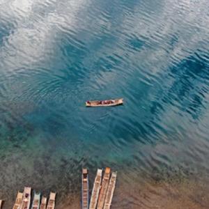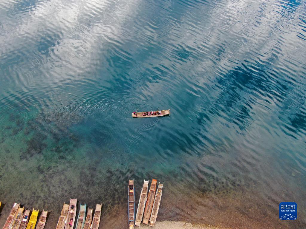 5月2日,游客在云南省麗江市寧蒗彝族自治縣境內的瀘沽湖乘船游覽(無人機照片)。