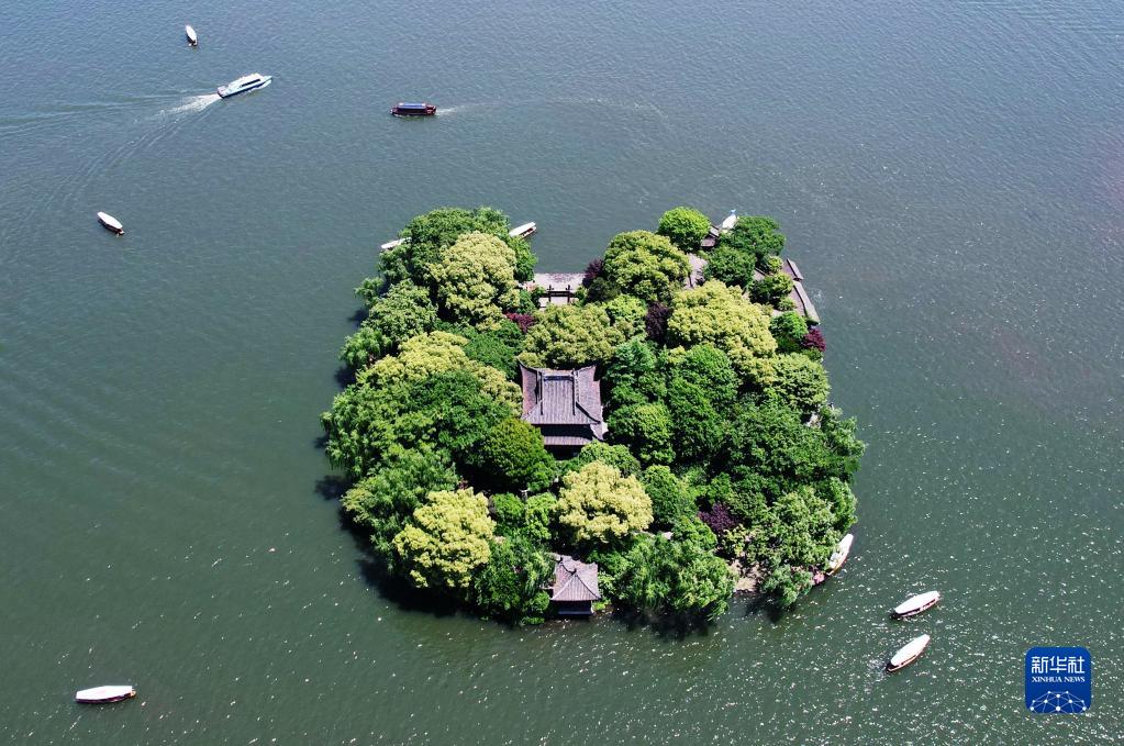 5月1日,游客乘坐游船游覽杭州西湖(無人機照片)。