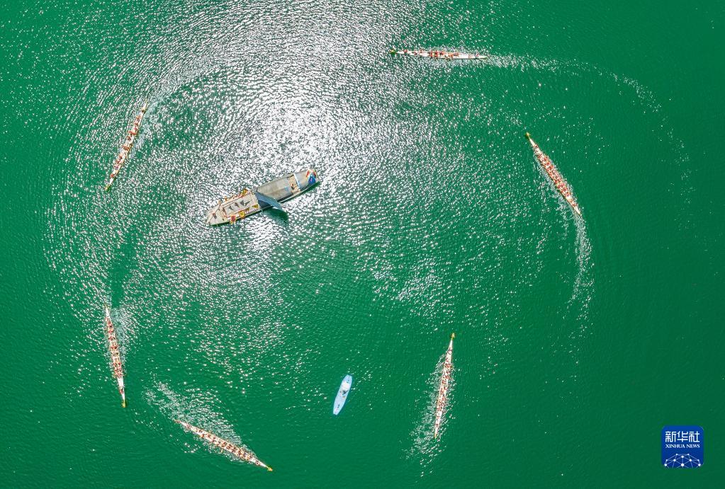 5月1日,湖北省宜昌市秭歸縣歸州鎮(zhèn)萬(wàn)古寺村村民與游客共同劃龍舟(無(wú)人機(jī)照片)。